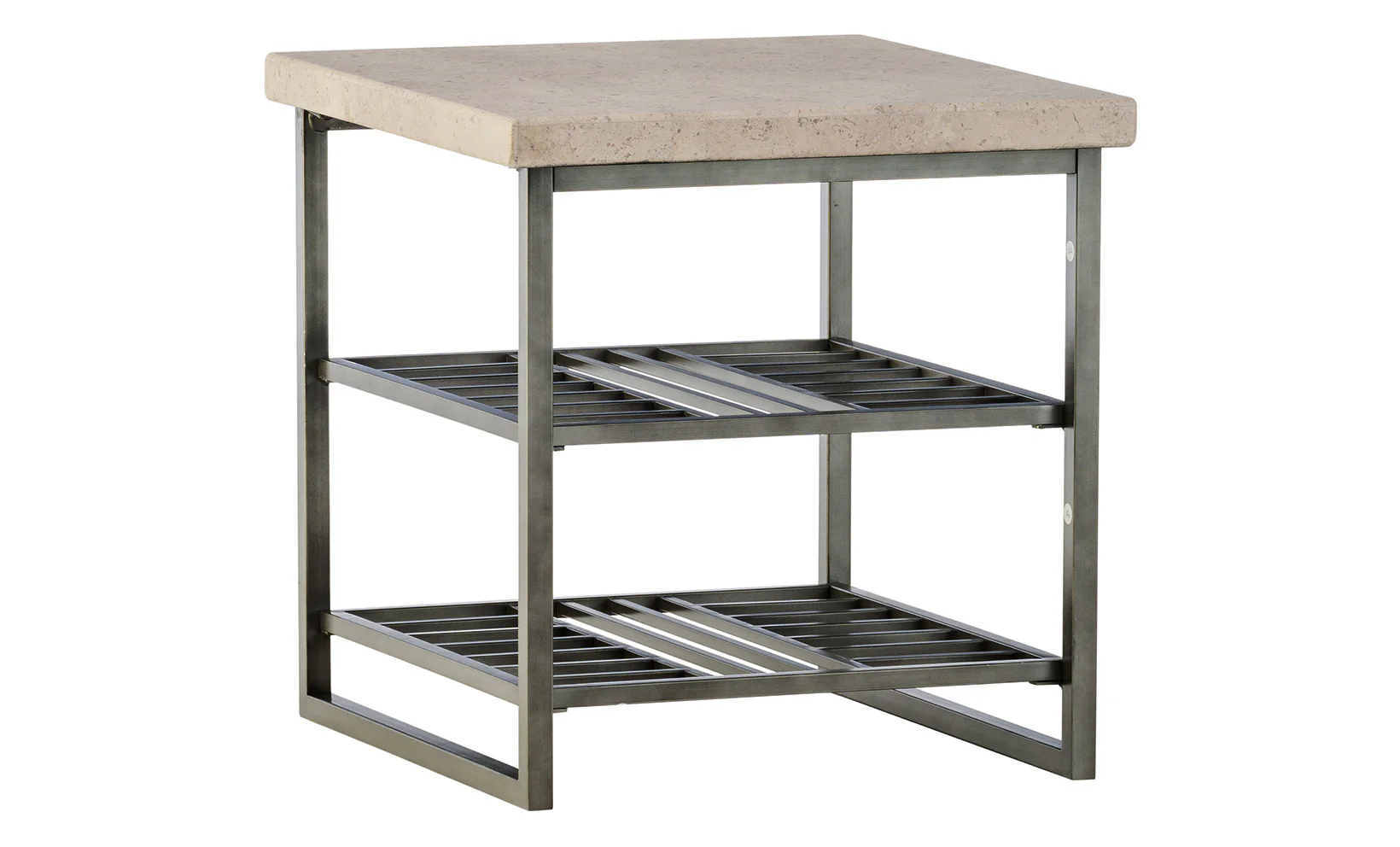 The Capri Side Table offers a transitional look that can complement its surroundings, instantly! Constructed of an alabaster travertine top and black metal base, the mixed materials flawlessly combine to create a contrasting work of art! The two fixed shelves are the perfect platform for magazines, games, or a basket with remotes and living essentials.