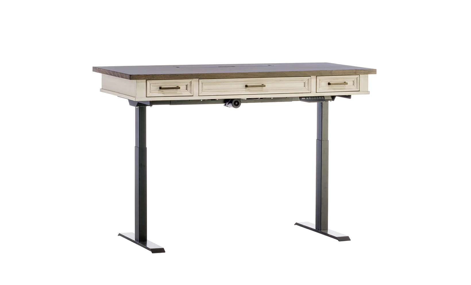 The farmhouse-inspired design of the Caraway collection reflects a stylish infusion of earthy and chic. The brass bar pull hardware adds to the visual appeal while leading to keyboard and storage utility space. Four memory positions with preset minimum and maximum height settings are found on the digital display touch controller, letting work be done standing up or sitting down!
