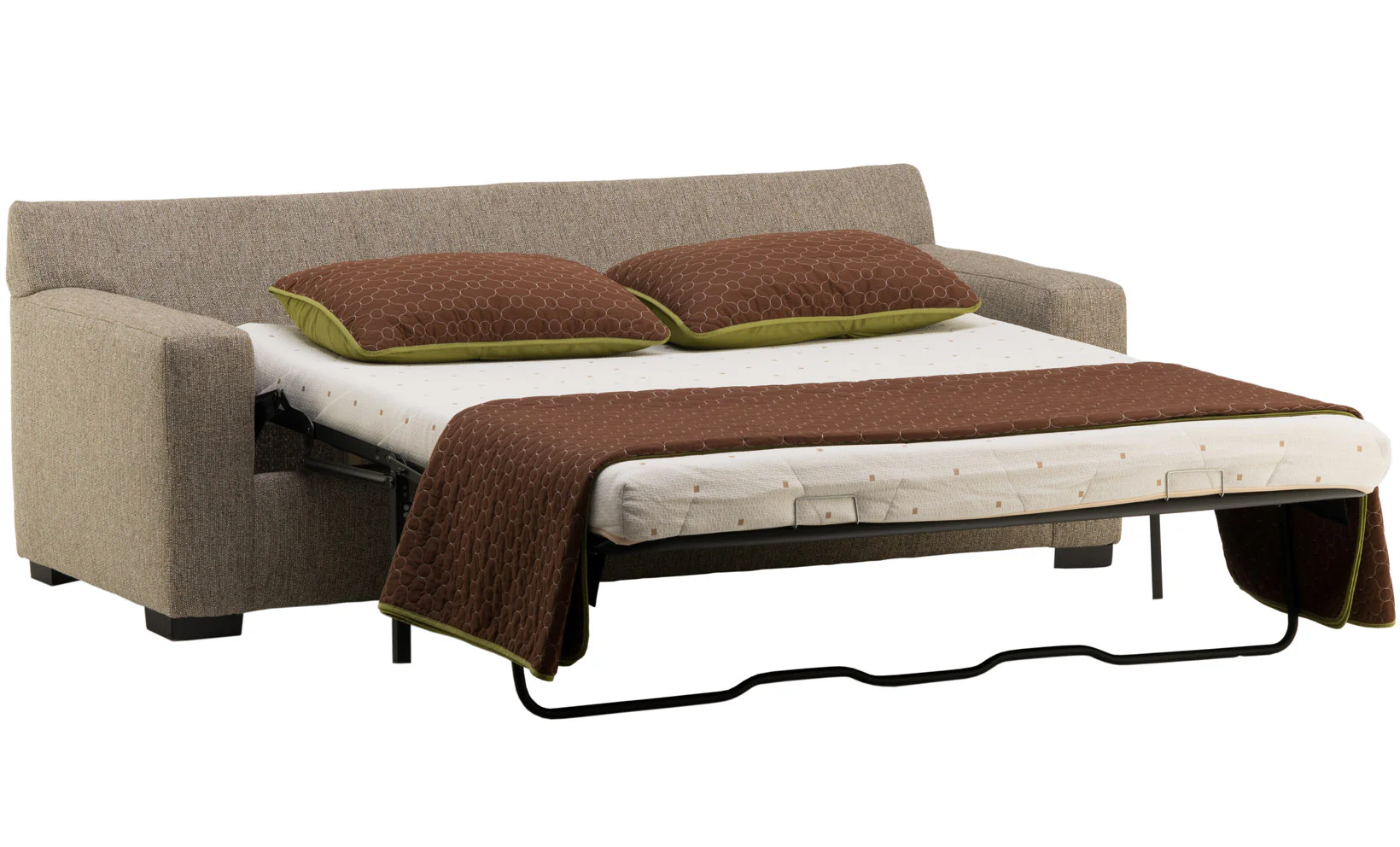 A modern three seat sofa chaise that doubles as extra sleeping space for your home. Stored inside is a queen size gel memory foam mattress that's perfect for guests spending the night. No one will know that the Desiree sleeper holds a secret with its stylish modern track arms, neutral cushions, and geometric contrast pillows. A small space option when you don't have that extra bedroom!