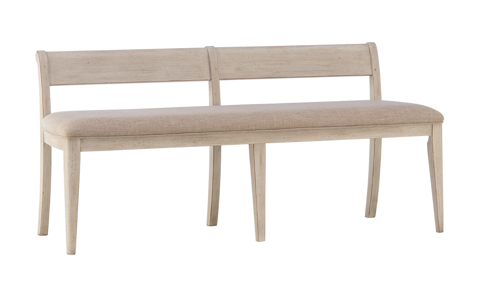 This gorgeous bench exudes farmhouse chic! The antique white finish gives a distressed vintage and rustic elegance while the backrest and upholstered seat cushion provide comfort. A thoughtfully crafted bench you can use as additional seating in the dining room or as an entryway accent!