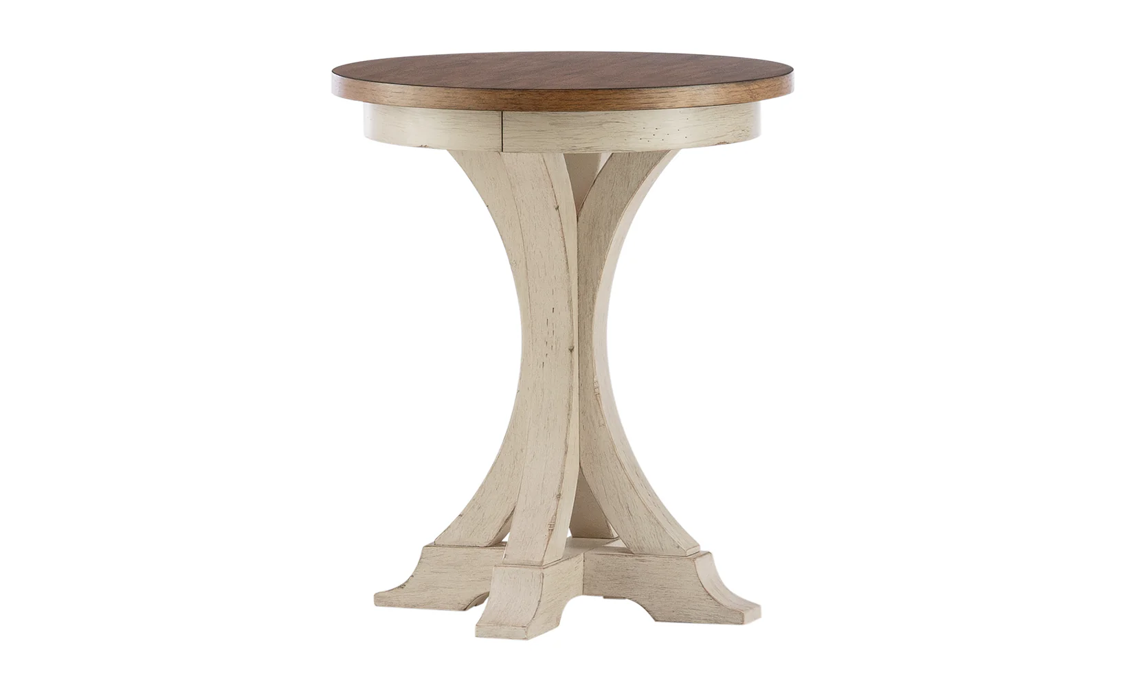 This gorgeous chairside table exudes farmhouse chic! The contrasting finishes offer a distressed vintage and rustic elegance. The circular design makes it a versatile piece that can be used anywhere throughout a home. A thoughtfully crafted table you'll adore in you bedroom!