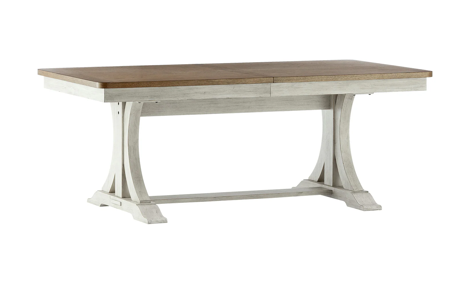 This gorgeous trestle dining table exudes farmhouse chic! The contrasting finishes offer a distressed vintage and rustic elegance. A thoughtfully crafted table with looks that easily work in today's homes styles!