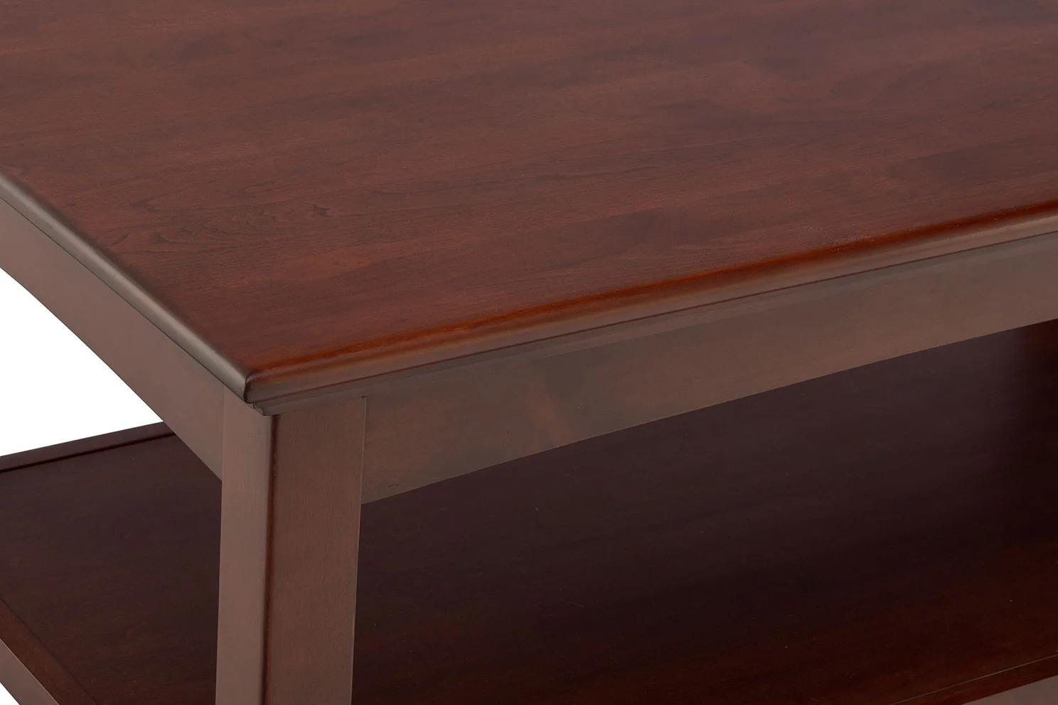 Beautiful design and elegant details make for a striking combination in the McKenzie Coffee Table. Made from American Alder hardwoods and completed with an Antique Cherry finish, this rectangular table is a durable and function piece with a transitional and timeless style. A lower fixed shelf provides a space for open storage, perfect for baskets or games when entertaining!